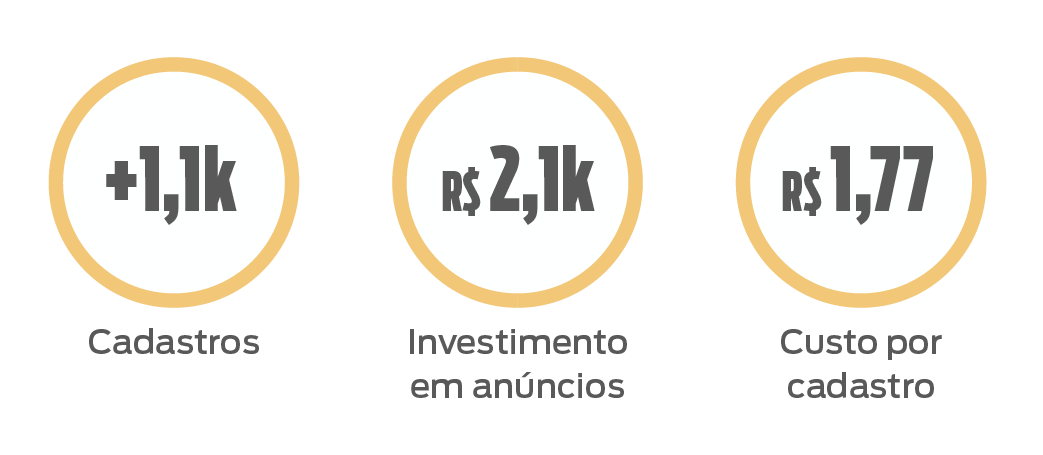 No total, foram 1.188 cadastros realizados nesse período, com um investimento de R$2.106,20 em anúncios. O custo por cada cadastro realizado ficou apenas R$ 1,77. Baratíssimo!